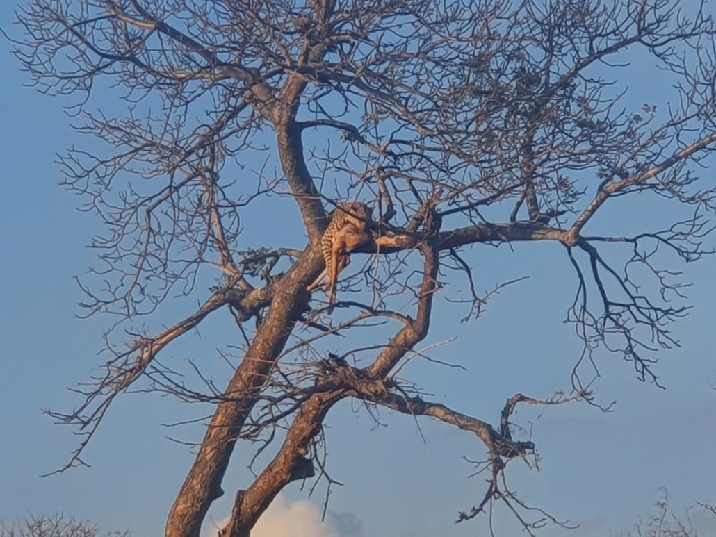 As we made our approach to the area after a beautifully set up sundowner break in the riverbed. We came across another Impala kill, only about 1,2km from the female Leopard. This kill layed wedged in a knob thorn tree and as we looked carefully we noticed a 2nd Impala in the tree. That’s right! Two dead impalas in the same knob thorn tree! From the sizes of these carcasses and seeing that it was 2, I was convinced that these kills were made by a very skilled and experienced male Leopard. He was nowhere to be seen at this time so we made our way to the Female leopard sighting and enjoyed that for a while before continuing our drive, not far from that point we came across the now 22 strong pack of African Wild Dogs which is Africa’s most endangered but also most successful predators.