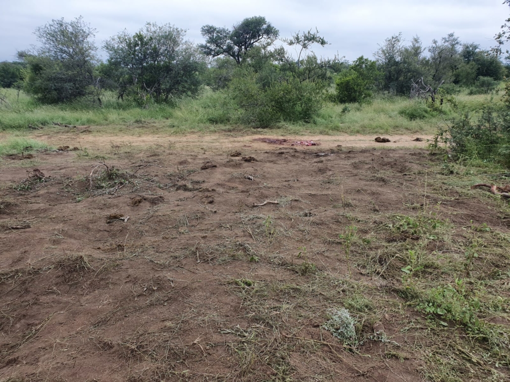 Photos below show the area completely flattened by a herd of elephants during the birth of a calf within the herd. The holes from small bushes that are removed are covered and stamped as well as grass cover removed. The actual birth spot where the Placenta is seen is on a gravel road. This was early morning before and raptors or scavengers cud get to it. During the birth taking place their is a lot of vocalization from the herd from excitement and anticipation and almost ritualistic in their behavior. Such display of empathy and emotions is not uncommon for these Pachyderms that also mourn their dead.