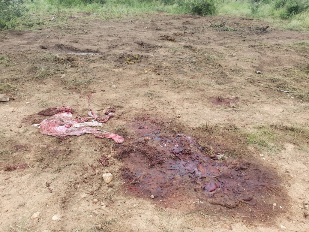 Photos below show the area completely flattened by a herd of elephants during the birth of a calf within the herd. The holes from small bushes that are removed are covered and stamped as well as grass cover removed. The actual birth spot where the Placenta is seen is on a gravel road. This was early morning before and raptors or scavengers cud get to it. During the birth taking place their is a lot of vocalization from the herd from excitement and anticipation and almost ritualistic in their behavior. Such display of empathy and emotions is not uncommon for these Pachyderms that also mourn their dead.